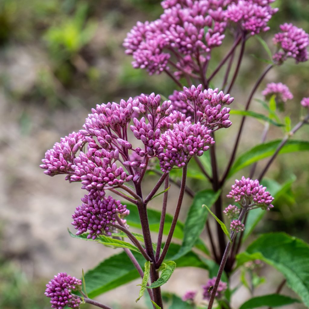 Joe Pye Weed is a valuable and beautiful native perennial and not a weed, despite its name. The name refers to a group of closely related North American species of the genus Eupatorium and is considered native to Colorado. Recent reclassification now puts Joe Pye Weed in both Eutrochium and Eupatorium genera, depending on physical traits. No matter. These handsome plants are known for their late-season blooms of lightly fragranced, pinkish-purple flowers that attract butterflies. They require moist soil conditions.