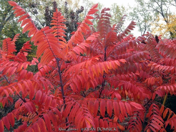 Smooth Sumac (Rhus glabra) is the only shrub or tree that is native to all the 48 contiguous states. It grows and spreads 8-10’ and is often used to create a thicket. It suckers vigorously, so prune it if you want to keep it in check. Dark-green leaves turn brilliant scarlet in fall. Yellow-green flowers are followed by bright red berries that birds love. Smooth sumac will grow in a variety of soil conditions where most plants would not survive and is used in many cities where low water requirements exist. This is not the plant known as poison sumac!