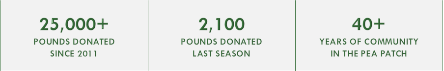 Since 2011 we have donated over 25,000 pounds of produce. Last season we donated 2,100 pounds. The Pea Patch has served the community for over 40 years.